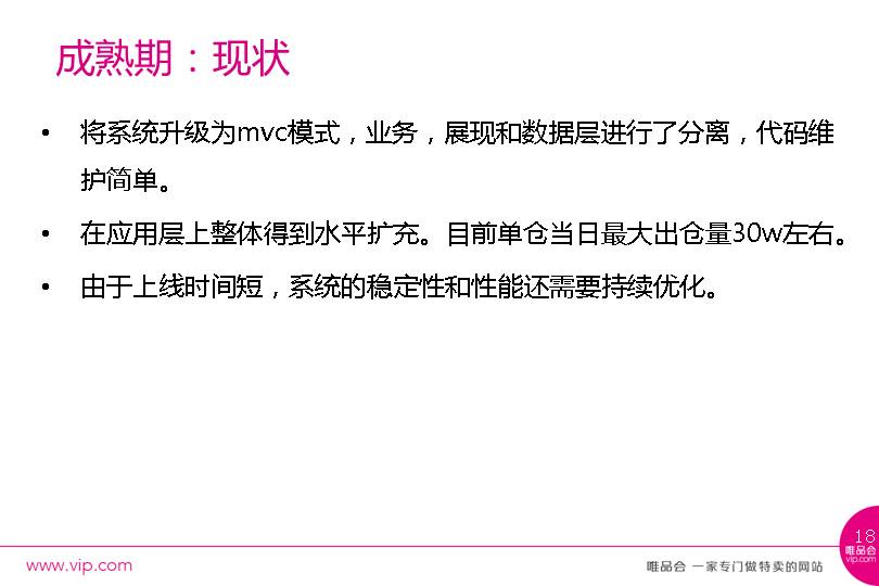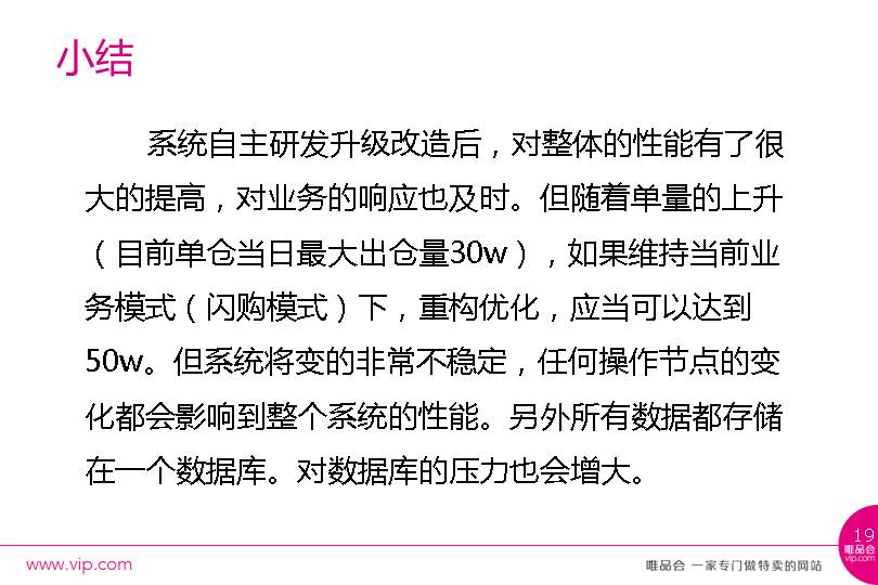 系统自主研发升级改造后,对整体的性能有了很大的提高,对业务的响应也及时。但随着单量的上升(目前单仓当日最大出仓量30w),如果维持当前业务模式(闪购模式)下,重构优化,应当可以达到50w。但系统将变的非常不稳定,任何操作节点的变化都会影响到整个系统的性能。另外所有数据都存储在一个数据库。对数据库的压力也会增大。