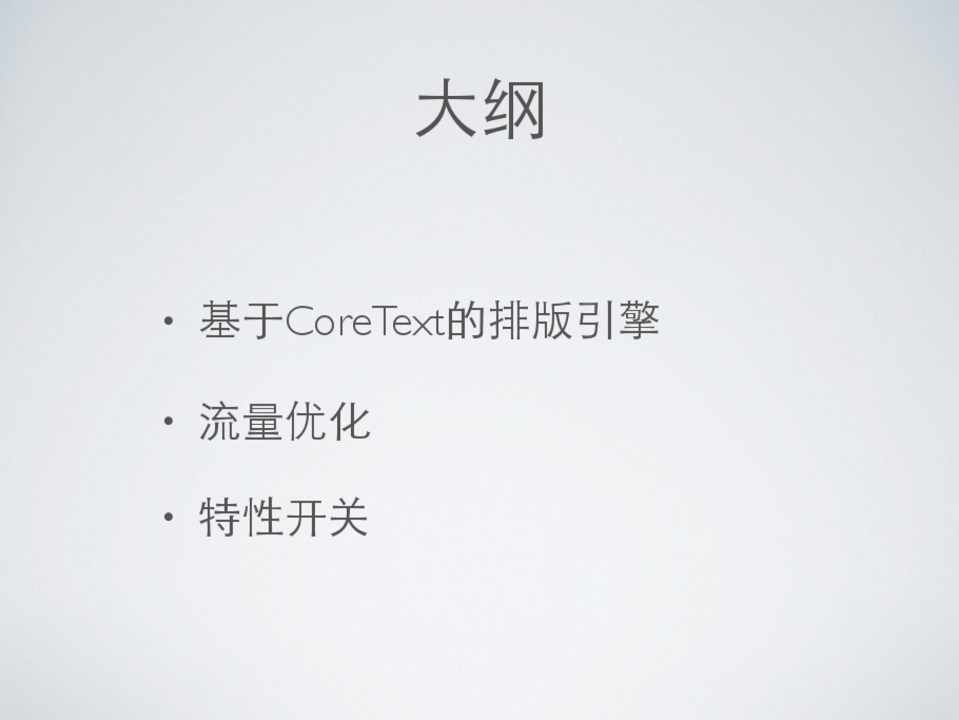 • 基于CoreText的排版引擎 • 流量优化 • 特性开关