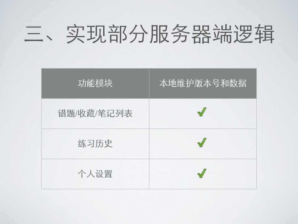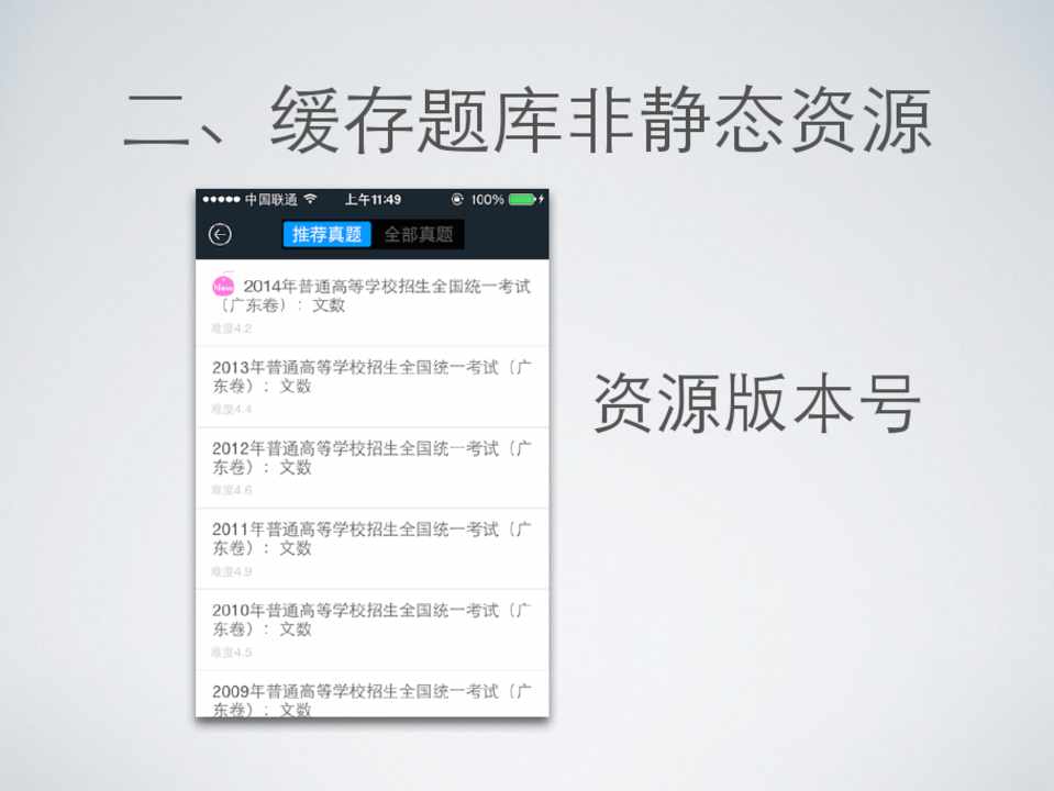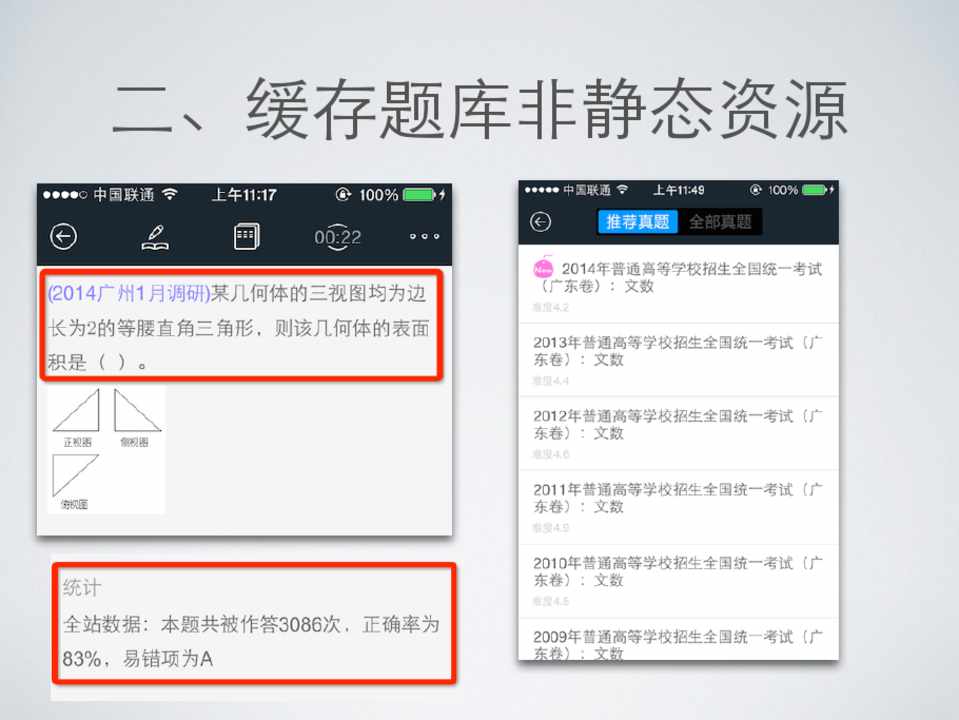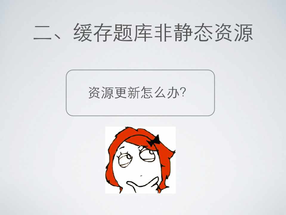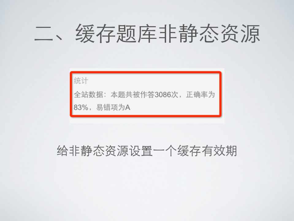 • 缓存题库静态资源 • 缓存题库⾮非静态资源和⽤用户数据 • 实现部分服务器端逻辑