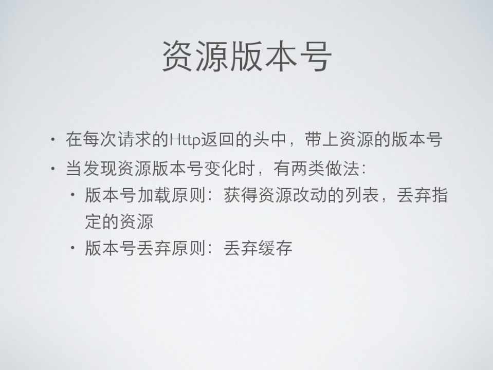 • 在每次请求的Http返回的头中,带上资源的版本号 • 当发现资源版本号变化时,有两类做法: