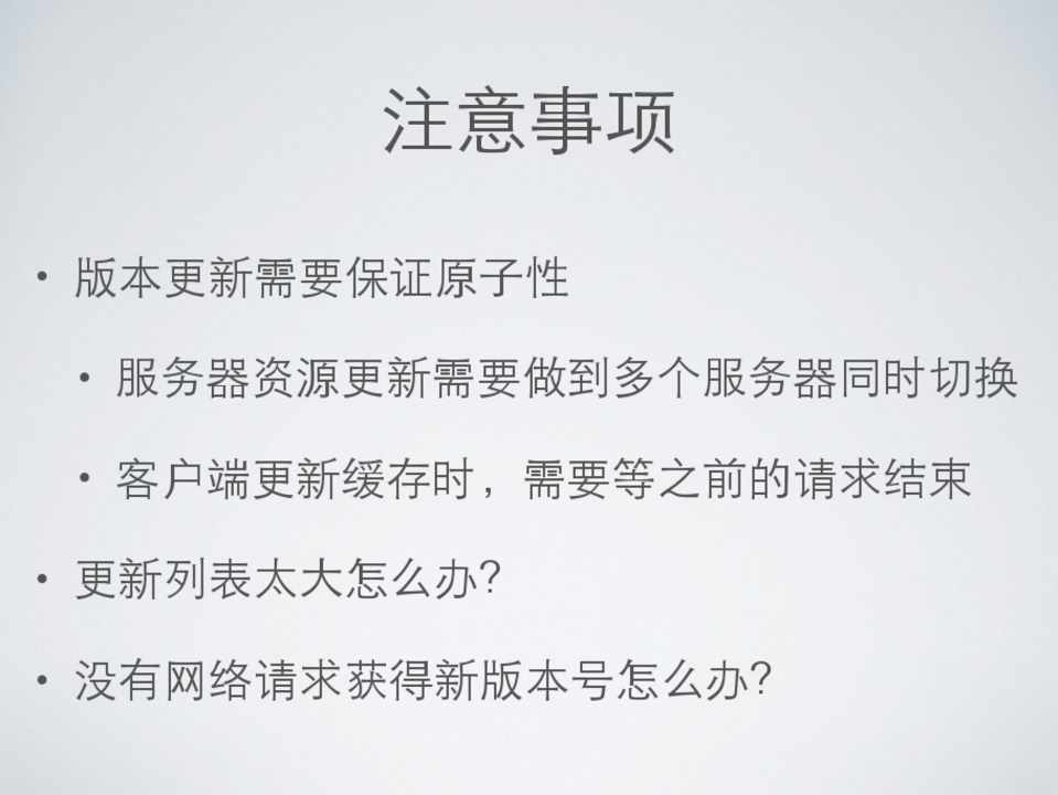 • 版本更新需要保证原⼦子性 • 服务器资源更新需要做到多个服务器同时切换 • 客户端更新缓存时,需要等之前的请求结束