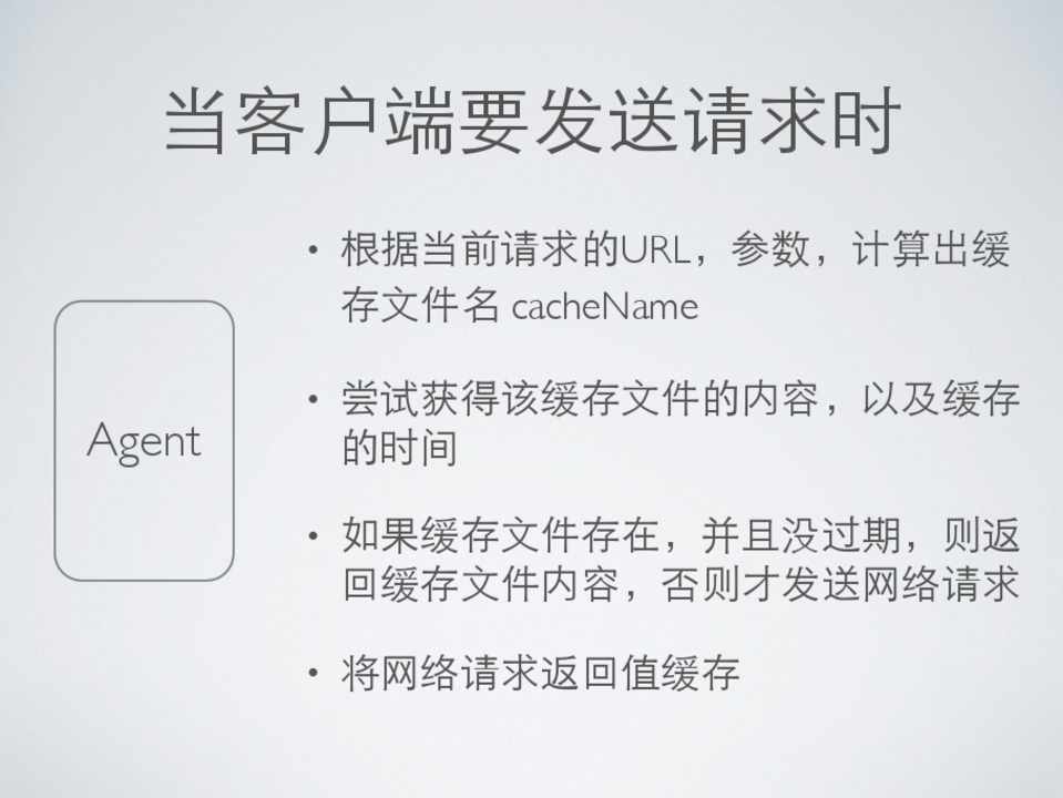 • 如果缓存⽂文件存在,并且没过期,则返 回缓存⽂文件内容,否则才发送⺴⽹网络请求