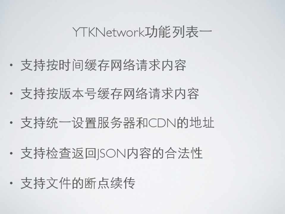 • ⽀支持按时间缓存⺴⽹网络请求内容 • ⽀支持按版本号缓存⺴⽹网络请求内容 • ⽀支持统⼀一设置服务器和CDN的地址 • ⽀支持检查返回JSON内容的合法性 • ⽀支持⽂文件的断点续传