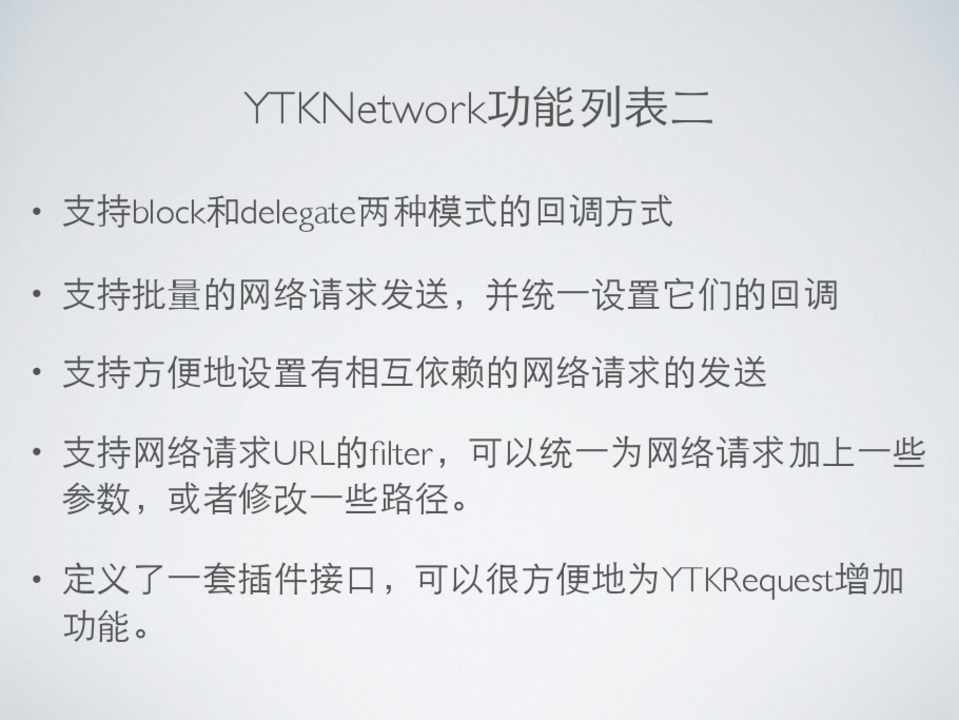 • 定义了⼀一套插件接⼝口,可以很⽅方便地为YTKRequest增加 功能。