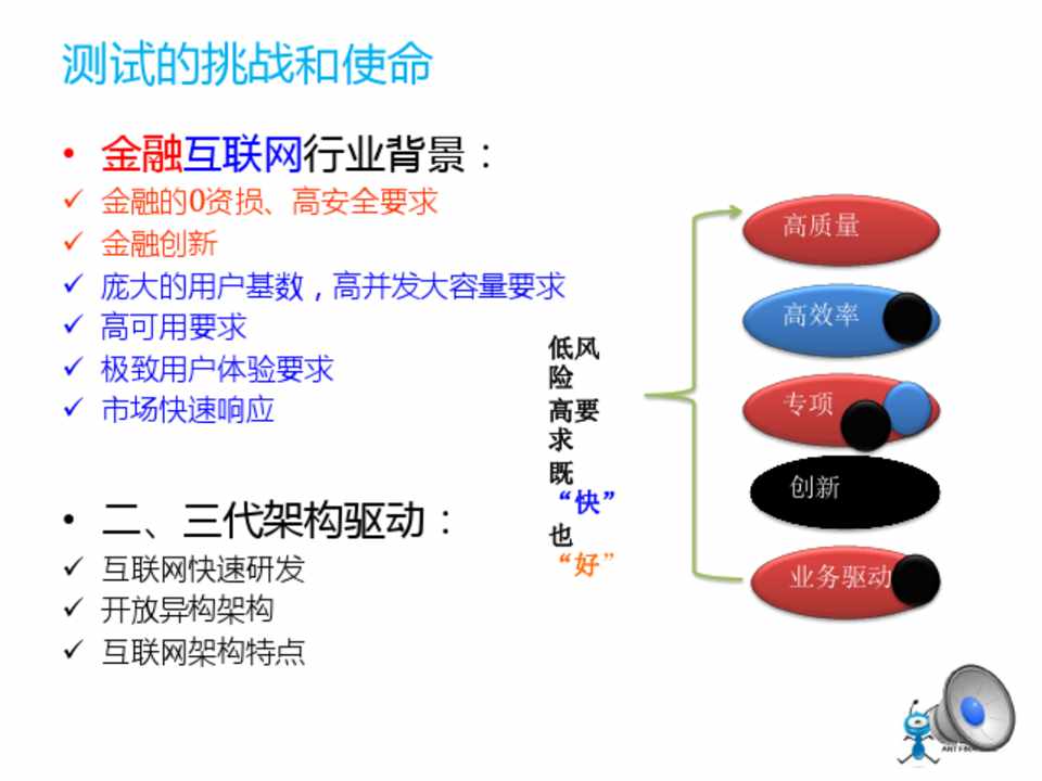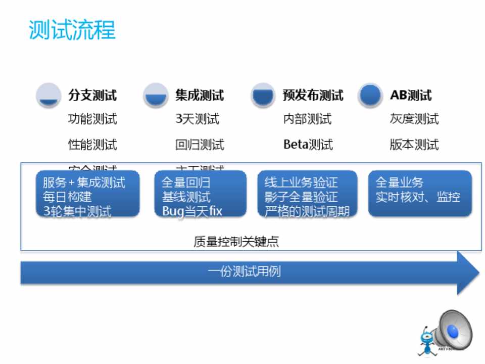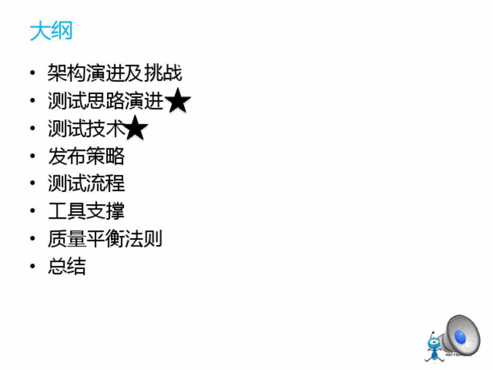 • 架构演进及挑战 • 测试思路演进 • 测试技术 • 发布策略 • 测试流程 • 工具支撑 • 质量平衡法则 • 总结