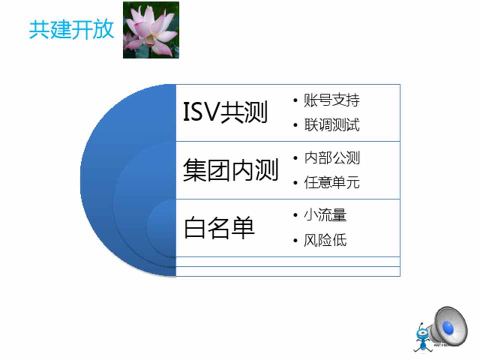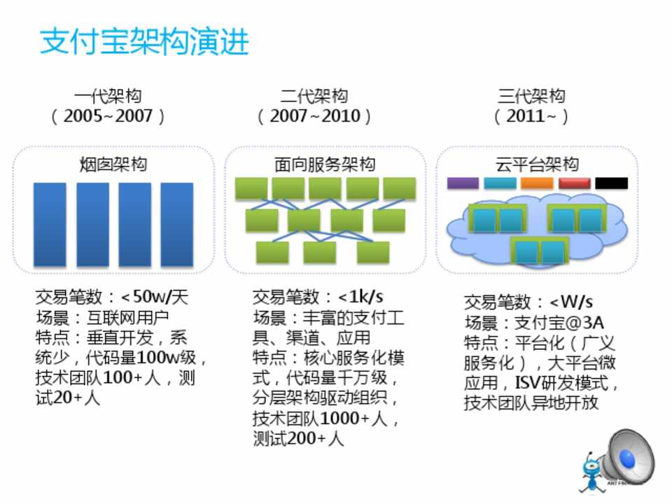 交易笔数:<W/s 场景:支付宝@3A 特点:平台化(广义 服务化),大平台微 应用,ISV研发模式, 技术团队异地开放