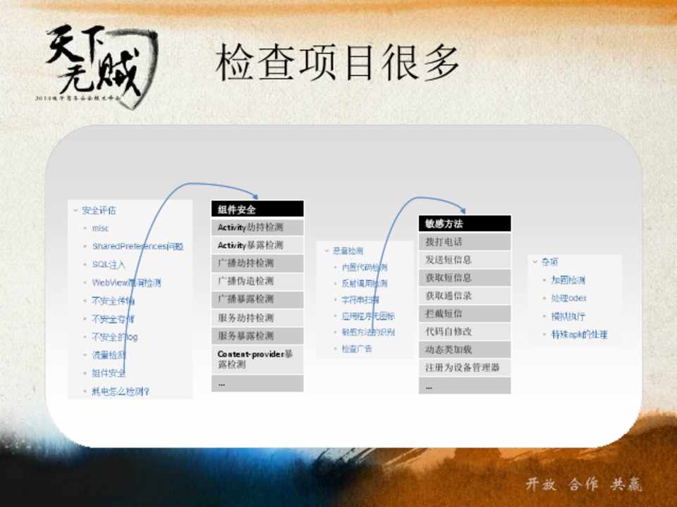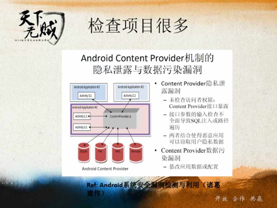 组件安全 Activity劫持检测 Activity暴露检测 广播劫持检测 广播伪造检测 广播暴露检测 服务劫持检测 服务暴露检测 Content-provider暴 露检测