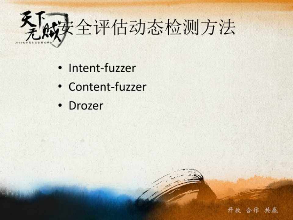 • Intent-fuzzer • Content-fuzzer • Drozer
