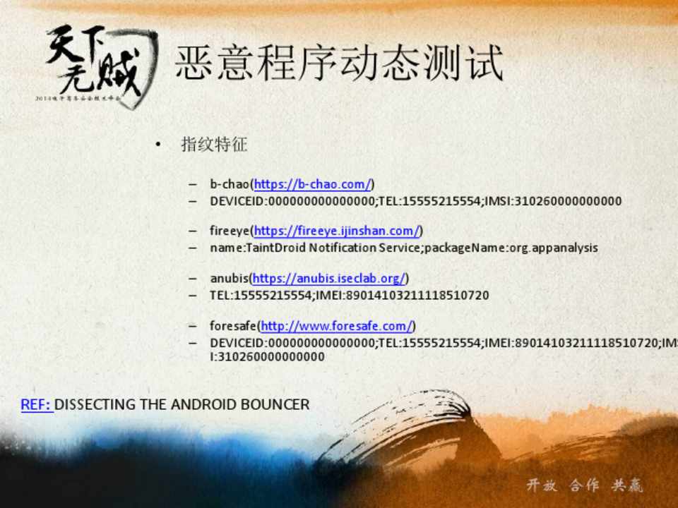 – b-chao(https://b-chao.com/) – DEVICEID:000000000000000;TEL:15555215554;IMSI:310260000000000 – fireeye(https://fireeye.ijinshan.com/) – name:TaintDroid Notification Service;packageName:org.appanalysis – anubis(https://anubis.iseclab.org/) – TEL:15555215554;IMEI:89014103211118510720 – foresafe(http://www.foresafe.com/) – DEVICEID:000000000000000;TEL:15555215554;IMEI:89014103211118510720;IMS