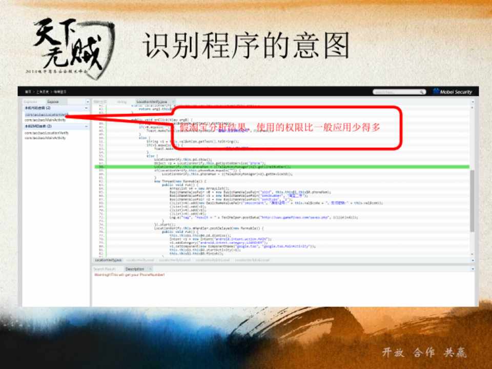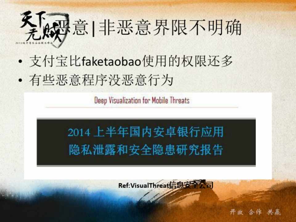 • 支付宝比faketaobao使用的权限还多 • 有些恶意程序没恶意行为
