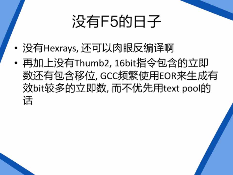 • 没有Hexrays, 还可以肉眼反编译啊 • 再加上没有Thumb2, 16bit指令包含的立即