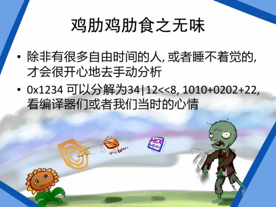 • 0x1234 可以分解为34|12<<8, 1010+0202+22, 看编译器们或者我们当时的心情