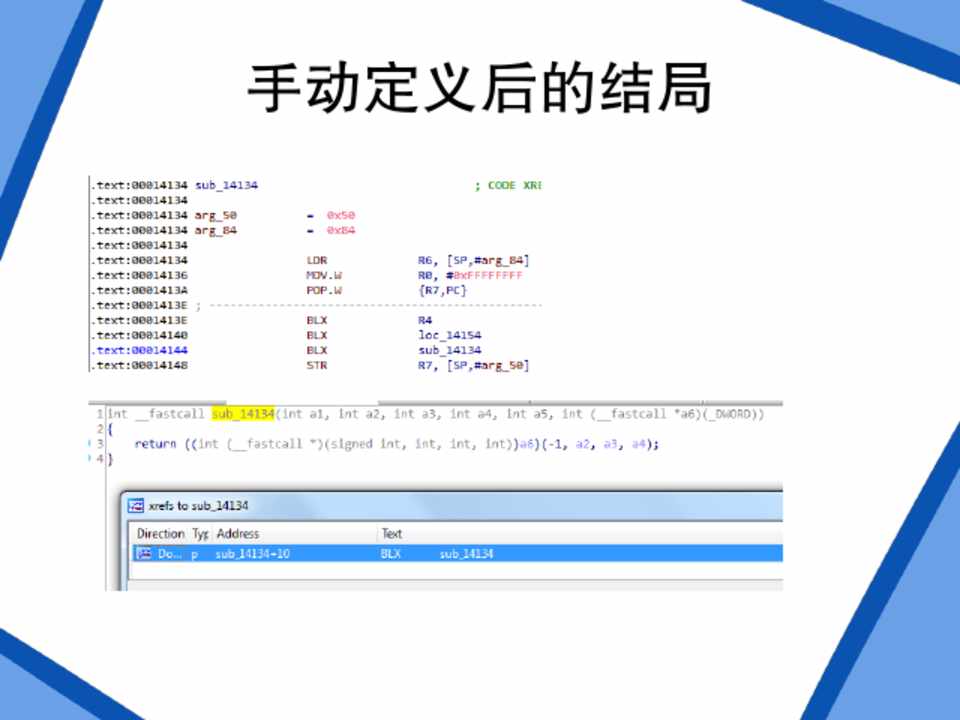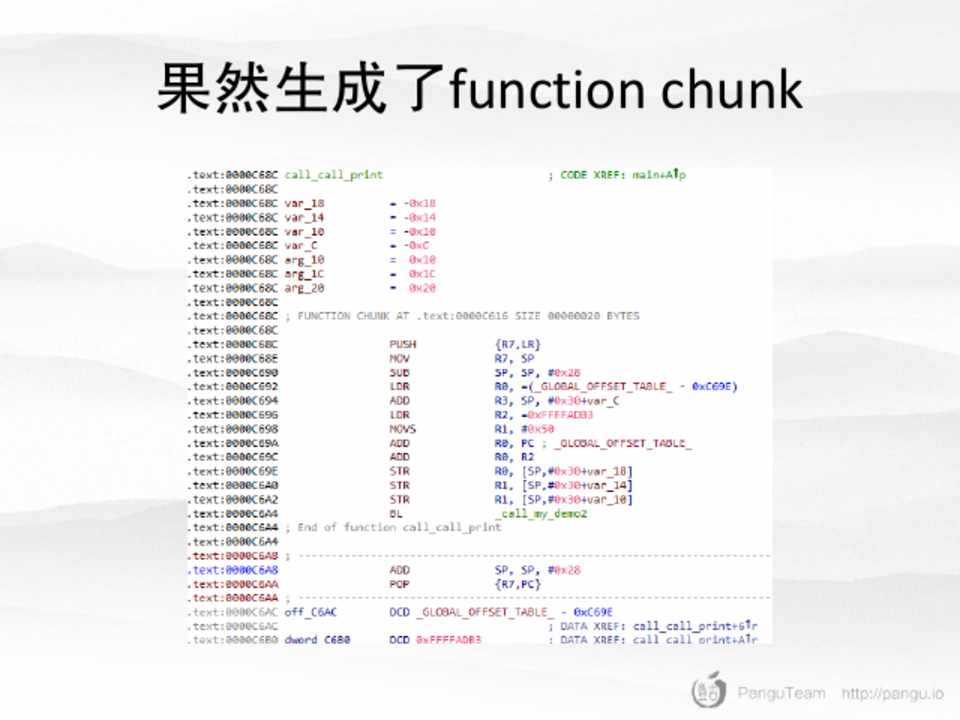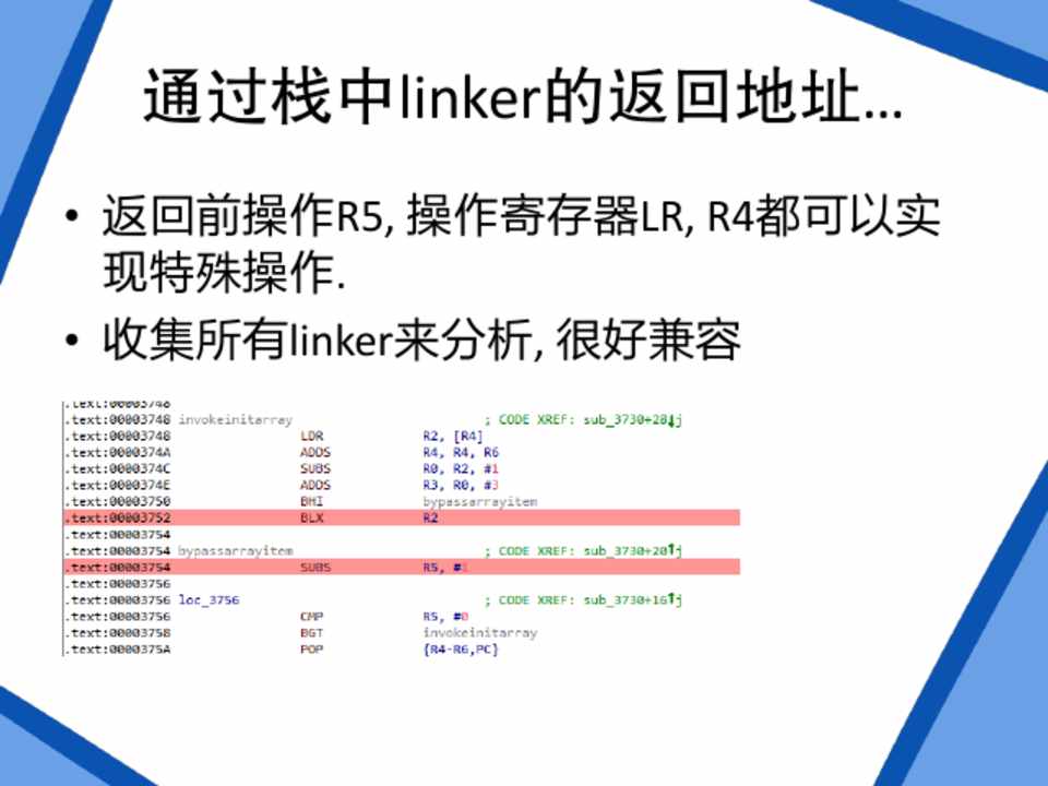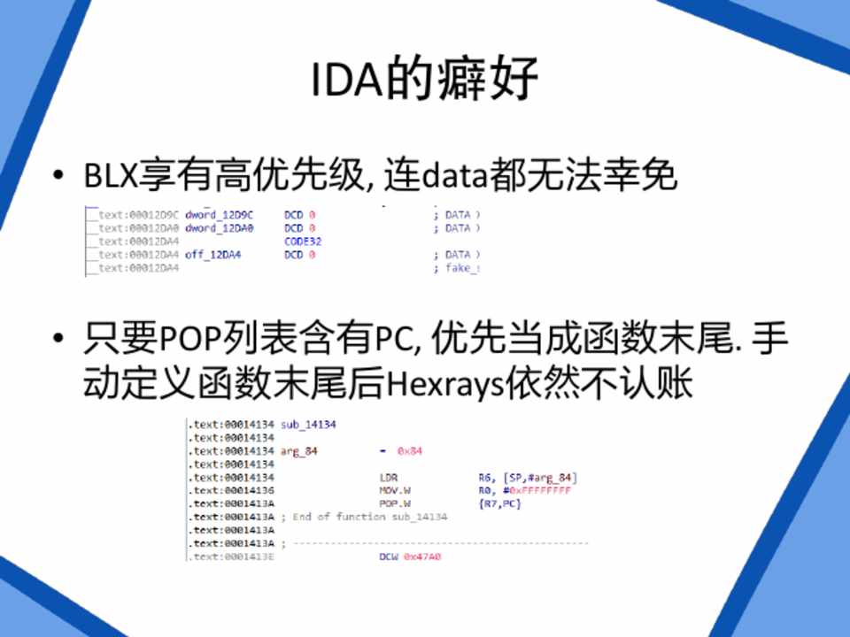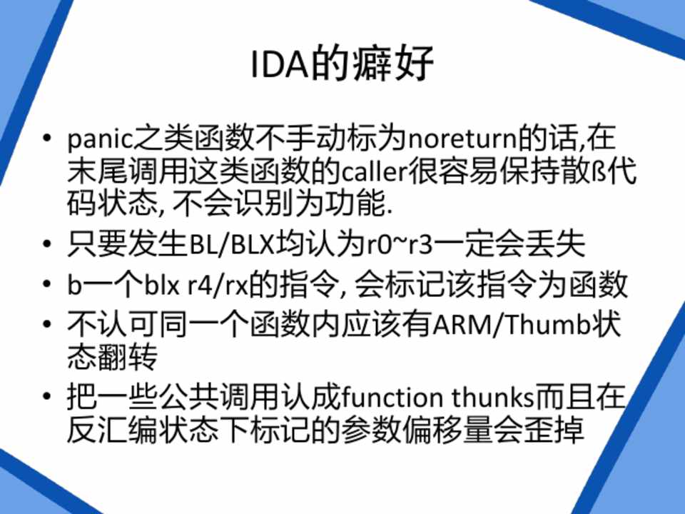 • 只要发生BL/BLX均认为r0~r3一定会丢失 • b一个blx r4/rx的指令, 会标记该指令为函数 • 不认可同一个函数内应该有ARM/Thumb状