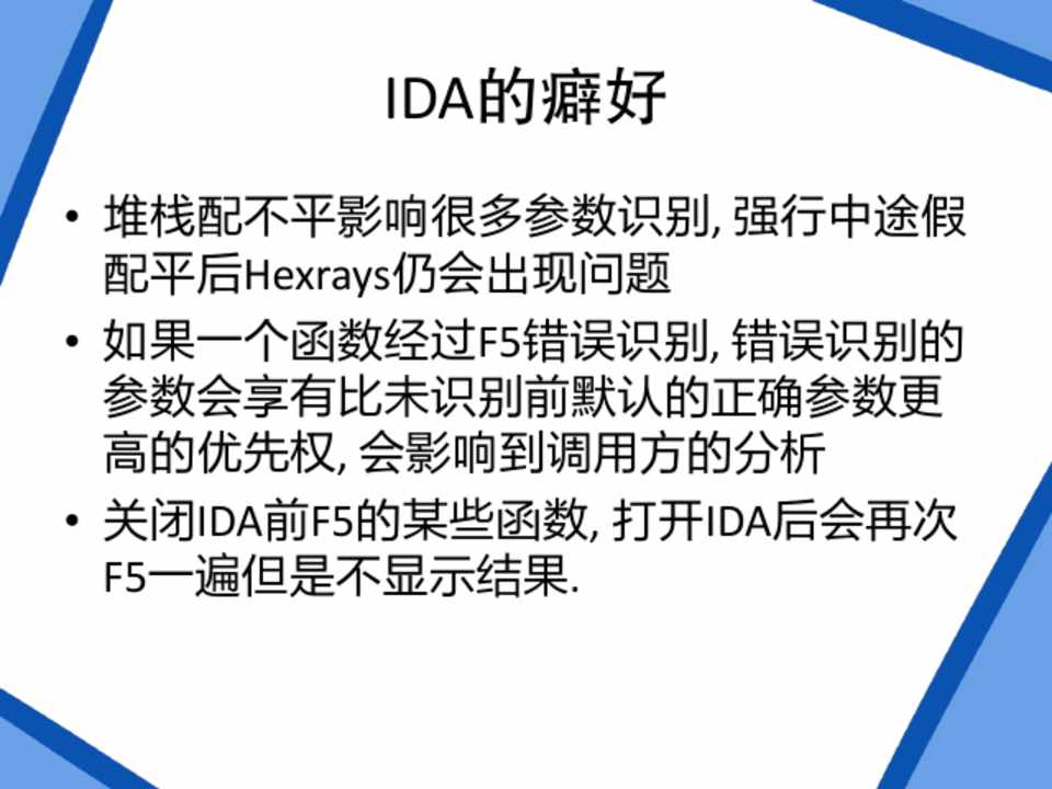 • 堆栈配不平影响很多参数识别, 强行中途假 配平后Hexrays仍会出现问题