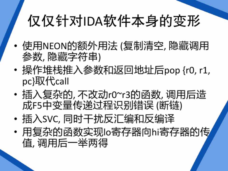 • 插入SVC, 同时干扰反汇编和反编译 • 用复杂的函数实现lo寄存器向hi寄存器的传