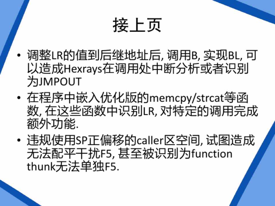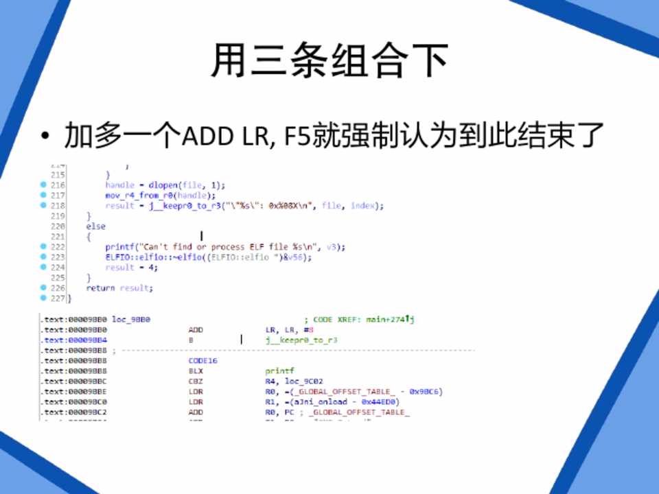 • 调整LR的值到后继地址后, 调用B, 实现BL, 可 以造成Hexrays在调用处中断分析或者识别 为JMPOUT