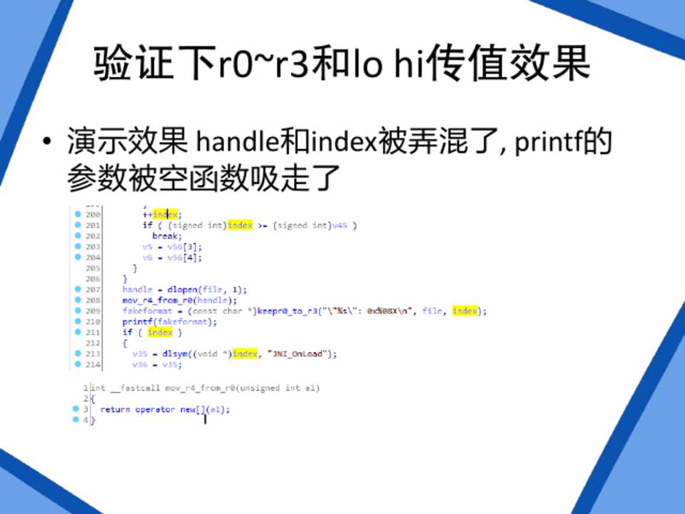 • 插入复杂的, 不改动r0~r3的函数, 调用后造 成F5中变量传递过程识别错误 (断链)