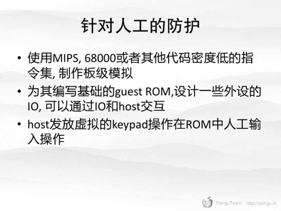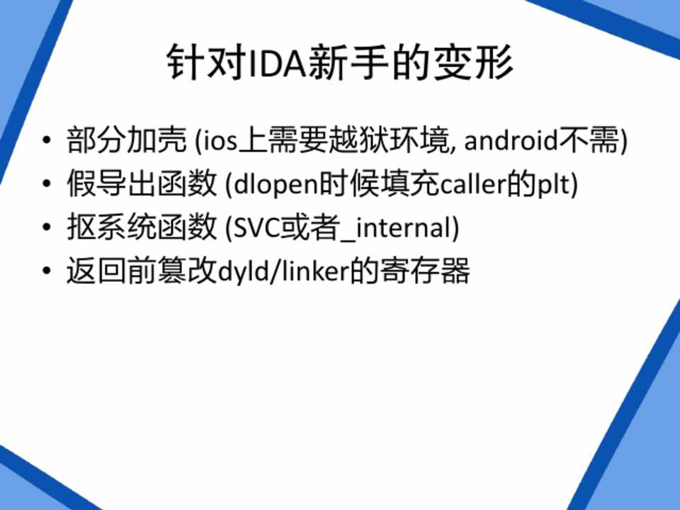 • 部分加壳 (ios上需要越狱环境, android不需) • 假导出函数 (dlopen时候填充caller的plt) • 抠系统函数 (SVC或者_internal) • 返回前篡改dyld/linker的寄存器