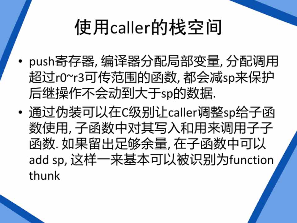 • 通过伪装可以在C级别让caller调整sp给子函 数使用, 子函数中对其写入和用来调用子子 函数. 如果留出足够余量, 在子函数中可以 add sp, 这样一来基本可以被识别为function thunk