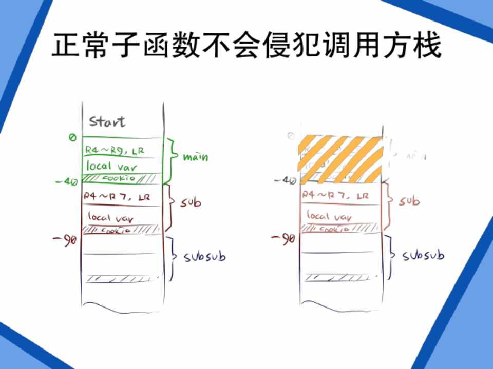 • push寄存器, 编译器分配局部变量, 分配调用 超过r0~r3可传范围的函数, 都会减sp来保护 后继操作不会动到大于sp的数据.