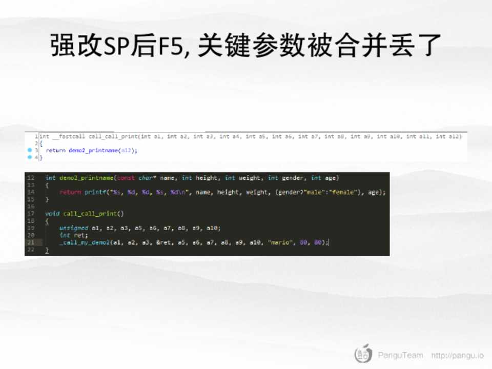 • 违规使用SP正偏移的caller区空间, 试图造成 无法配平干扰F5, 甚至被识别为function thunk无法单独F5.