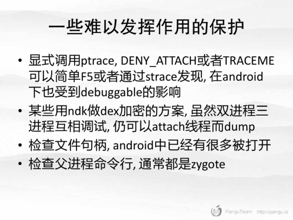 • 某些用ndk做dex加密的方案, 虽然双进程三 进程互相调试, 仍可以attach线程而dump