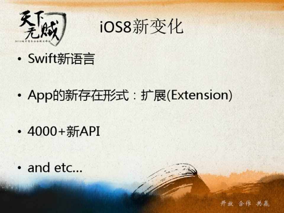 • Swift新语言 • App的新存在形式:扩展(Extension) • 4000+新API • and etc…