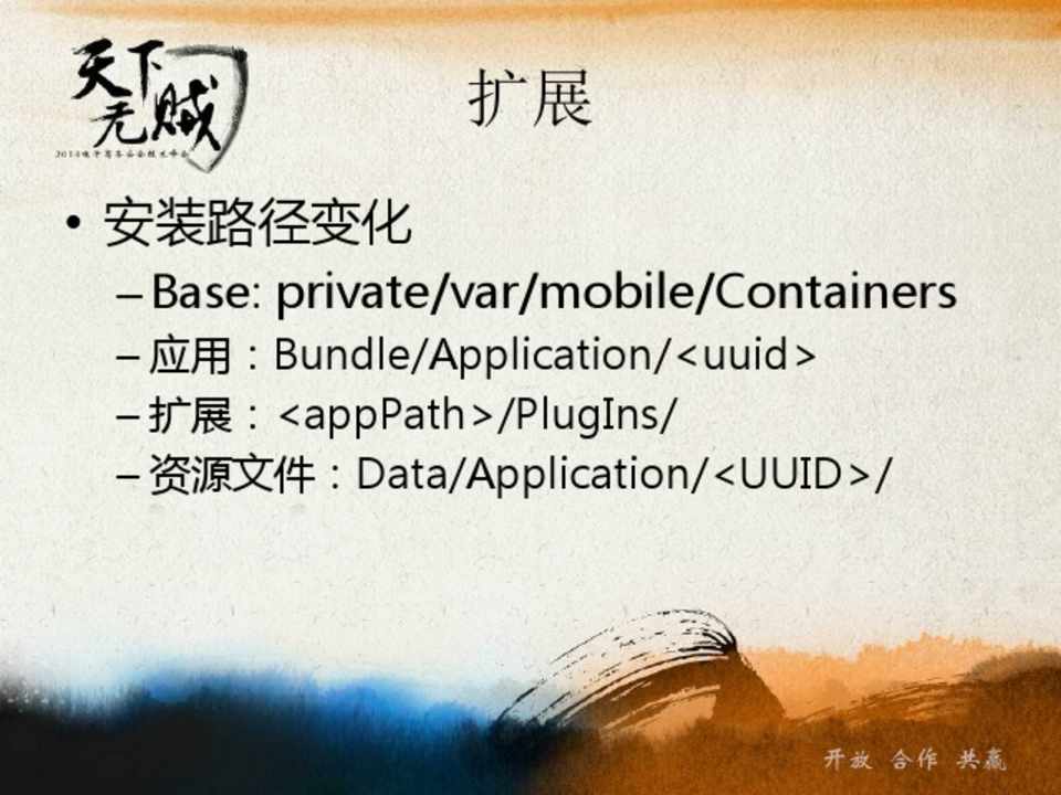 – 应用:Bundle/Application/<uuid> – 扩展:<appPath>/PlugIns/ – 资源文件:Data/Application/<UUID>/