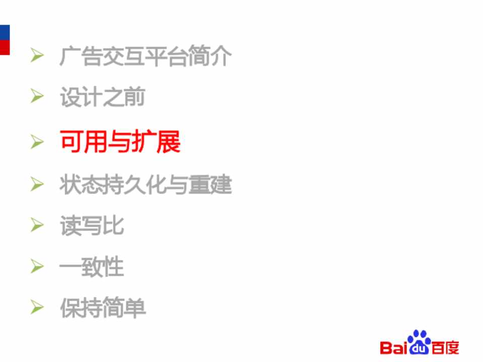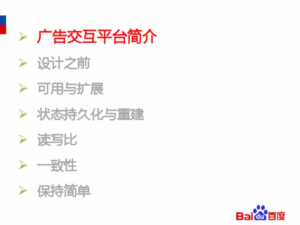 Ø 广告交互平台简介 Ø 设计之前 Ø 可用与扩展 Ø 状态持久化与重建 Ø 读写比 Ø 一致性
