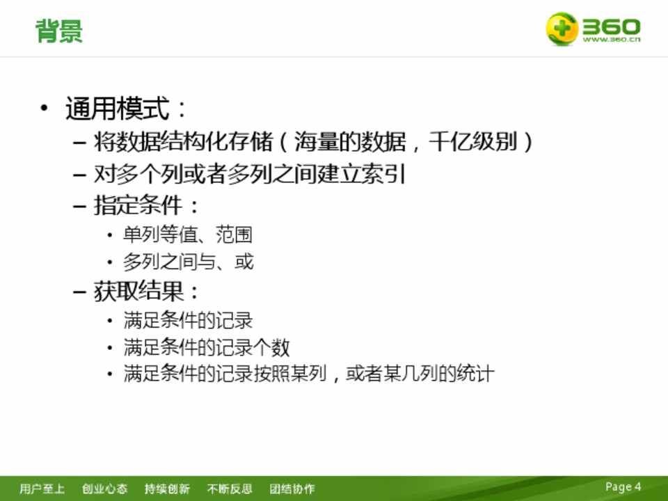 – 将数据结构化存储(海量的数据,千亿级别) – 对多个列或者多列之间建立索引 – 指定条件: