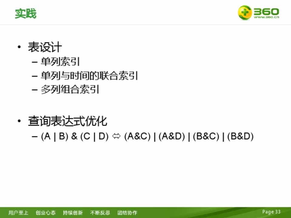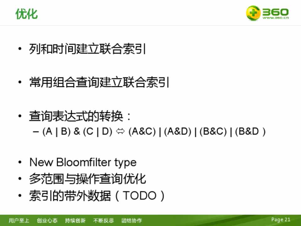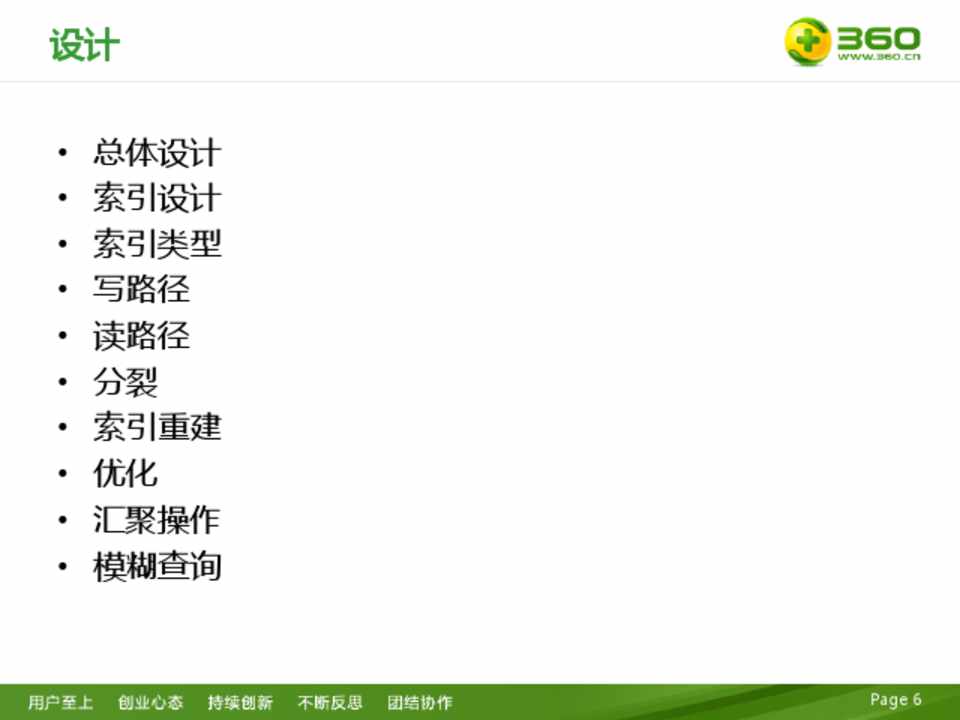 • 总体设计 • 索引设计 • 索引类型 • 写路径 • 读路径 • 分裂 • 索引重建 • 优化 • 汇聚操作 • 模糊查询