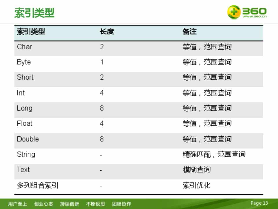 索引类型  Char  Byte  Short  Int  Long  Float  Double  String  Text  多列组合索引
