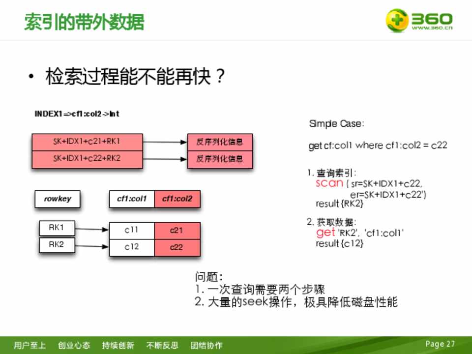 • 多字段分别作为RK,写入多次 • 组合字段作为RK,设计复杂,不灵活 – 不经过索引的并行scan过滤,大量资源消耗,无实效性可言