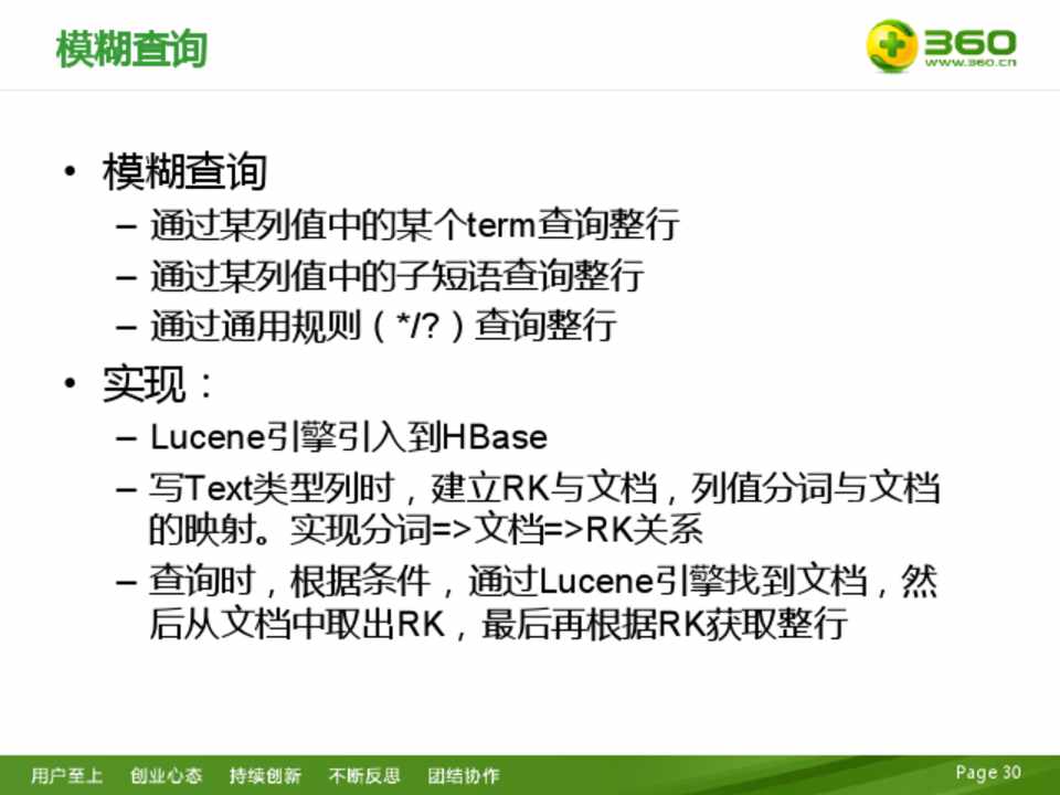 – Lucene引擎引入到HBase – 写Text类型列时,建立RK与文档,列值分词与文档