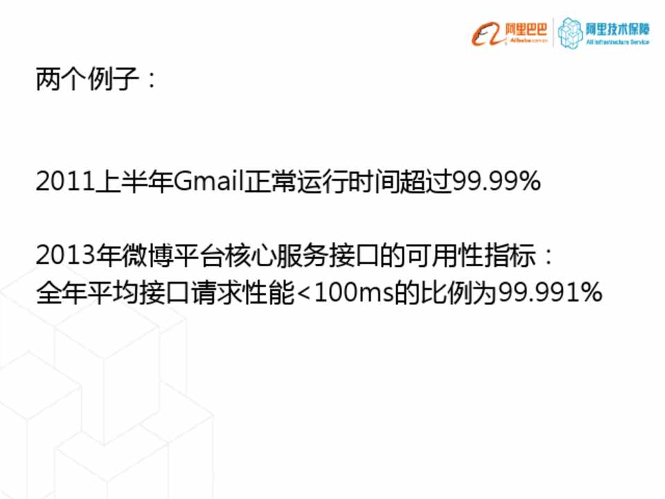2011上半年Gmail正常运行时间超过99.99% 2013年微博平台核心服务接口的可用性指标: 全年平均接口请求性能<100ms的比例为99.991%