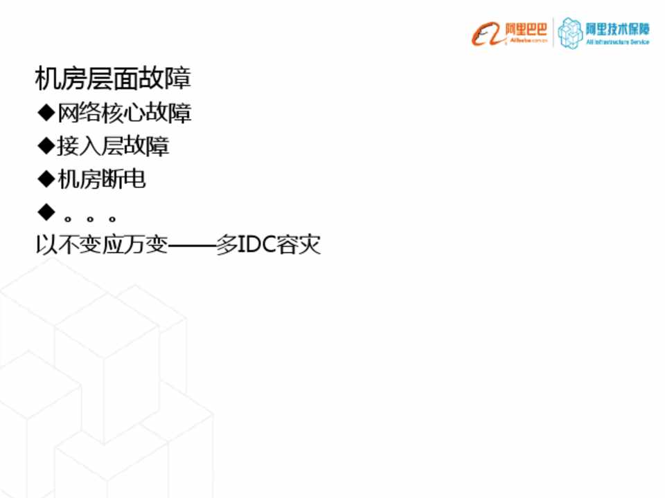 u网络核心故障 u接入层故障 u机房断电 u 。。。 以不变应万变——多IDC容灾