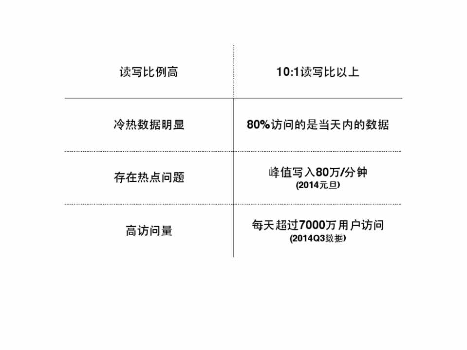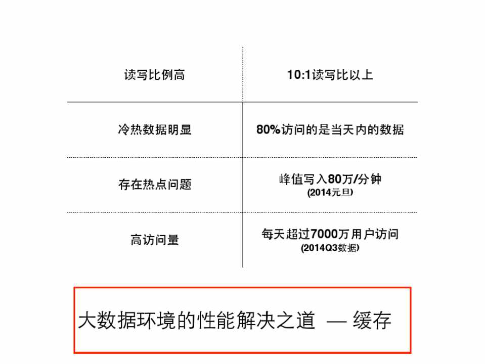读写⽐比例⾼高 冷热数据明显 存在热点问题