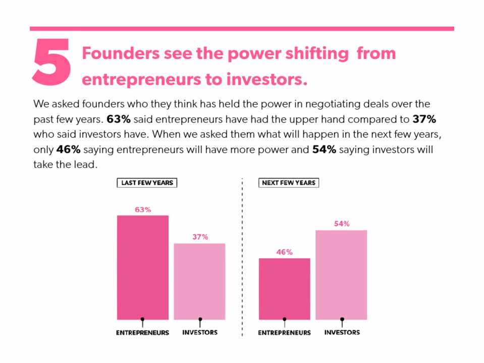 We asked founders who they think has held the power in negotiating deals over the past few years. 63% said entrepreneurs have had the upper hand compared to 37% who said investors have. When we asked them what will happen in the next few years, only 46% saying entrepreneurs will have more power and 54% saying investors will take the lead.