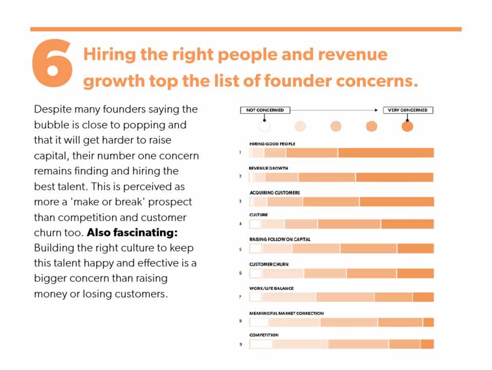 Despite many founders saying the bubble is close to popping and that it will get harder to raise capital, their number one concern remains finding and hiring the best talent. This is perceived as more a 'make or break' prospect than competition and customer churn too. Also fascinating: Building the right culture to keep this talent happy and effective is a bigger concern than raising money or losing customers.
