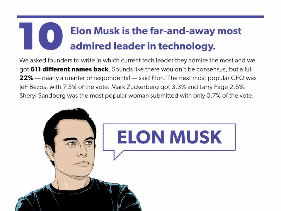 We asked founders to write in which current tech leader they admire the most and we got 611 different names back. Sounds like there wouldn't be consensus, but a full 22% — nearly a quarter of respondents! — said Elon. The next most popular CEO was Jeff Bezos, with 7.5% of the vote. Mark Zuckerberg got 3.3% and Larry Page 2.6%. Sheryl Sandberg was the most popular woman submitted with only 0.7% of the vote.