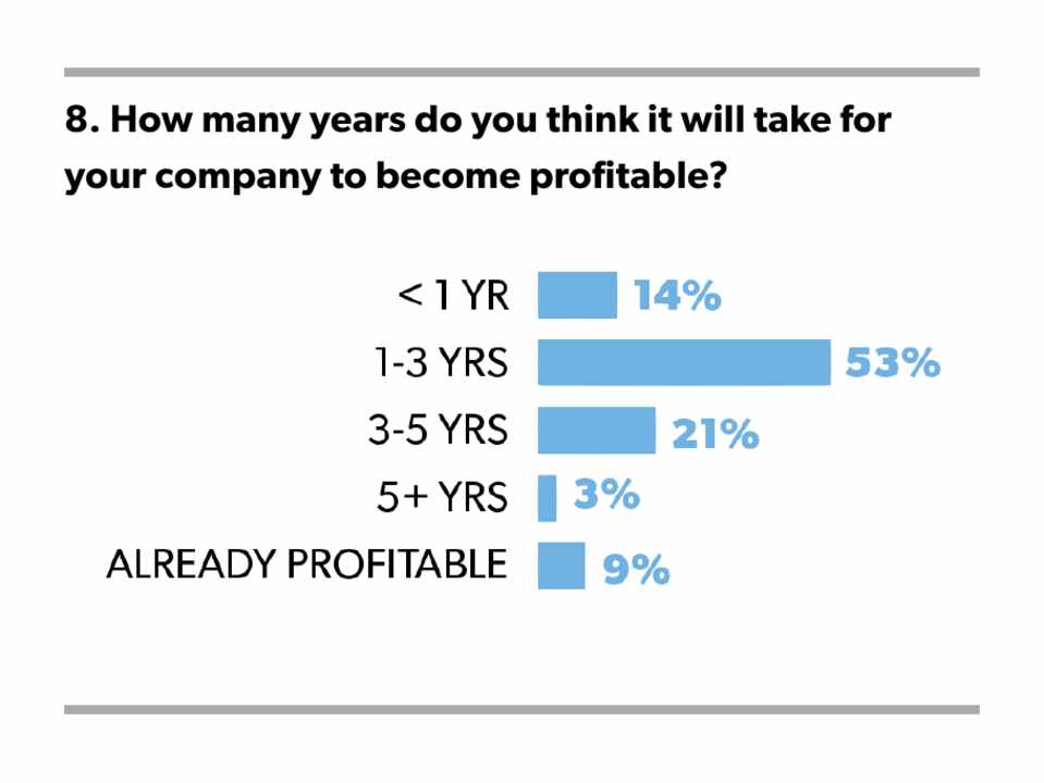 Oddly, we did find that a huge chunk of early-stage founders believe their companies will go public in the next 3 years, whereas most late-stage founders said it would take more than 7 years for their companies to IPO. It seems the further you go down the road as an entrepreneur, the more distant that horizon gets.