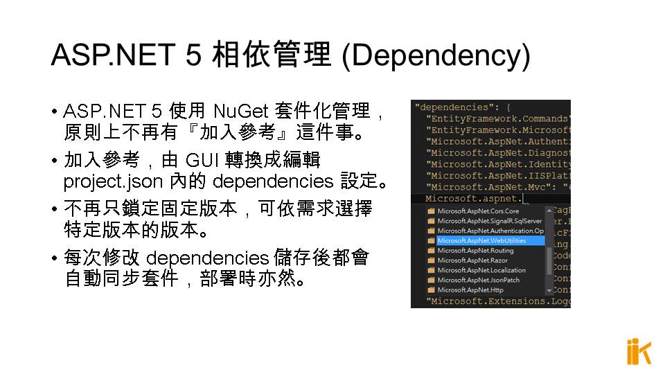 ASP.NET 5 使用 NuGet 套件化管理,原則上不再有『加入參考』這件事。