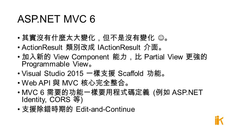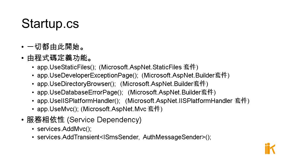 MVC 6 需要的功能一樣要用程式碼定義 (例如 ASP.NET Identity, CORS 等)
