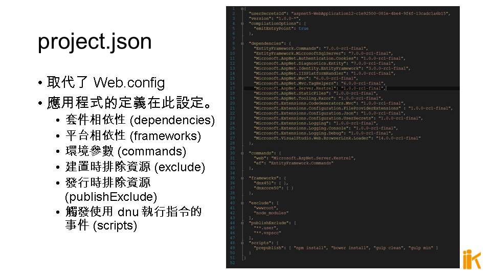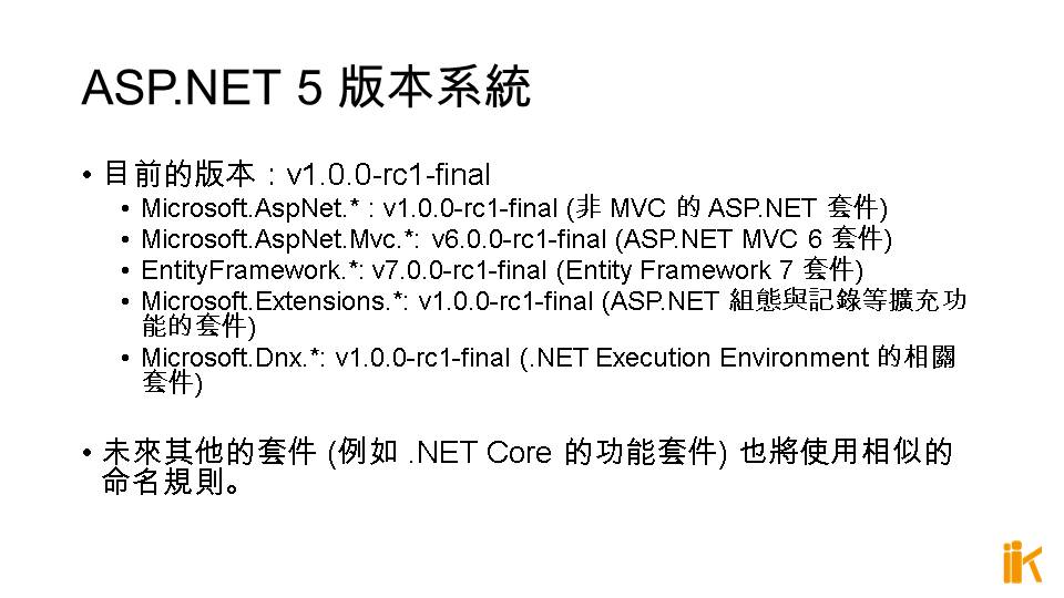 Microsoft.Extensions.*: v1.0.0-rc1-final (ASP.NET 組態與記錄等擴充功能的套件)