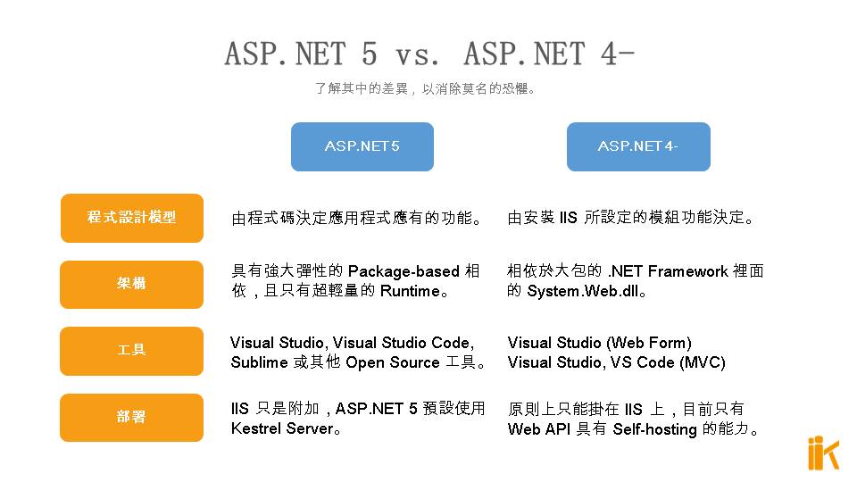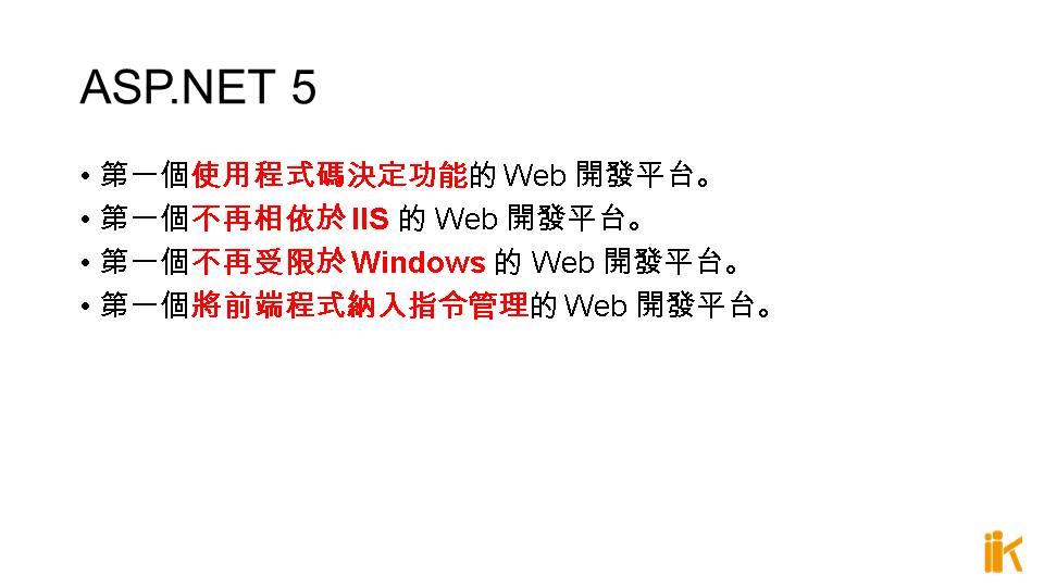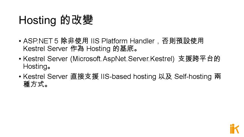 ASP.NET 5 除非使用 IIS Platform Handler,否則預設使用 Kestrel Server 作為 Hosting 的基底。