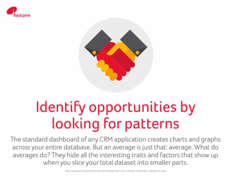 The standard dashboard of any CRM application creates charts and graphs across your entire database. But an average is just that: average. What do averages do? They hide all the interesting traits and factors that show up
