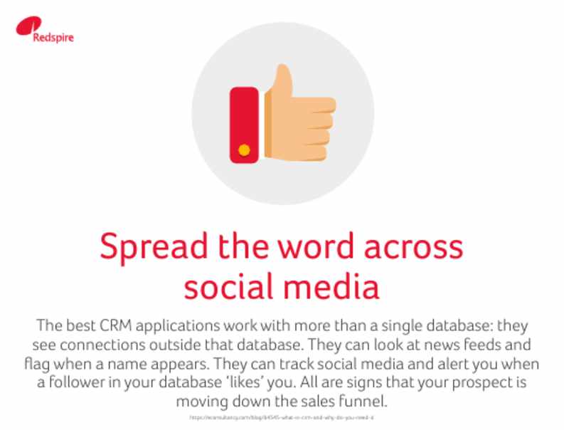 The best CRM applications work with more than a single database: they see connections outside that database. They can look at news feeds and flag when a name appears. They can track social media and alert you when a follower in your database ‘likes’ you. All are signs that your prospect is