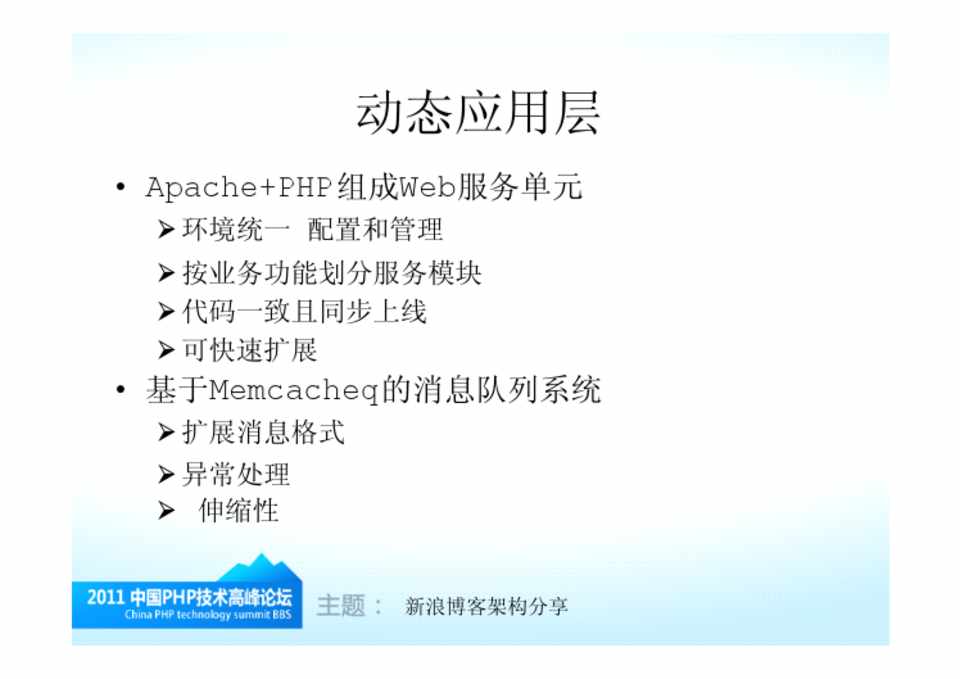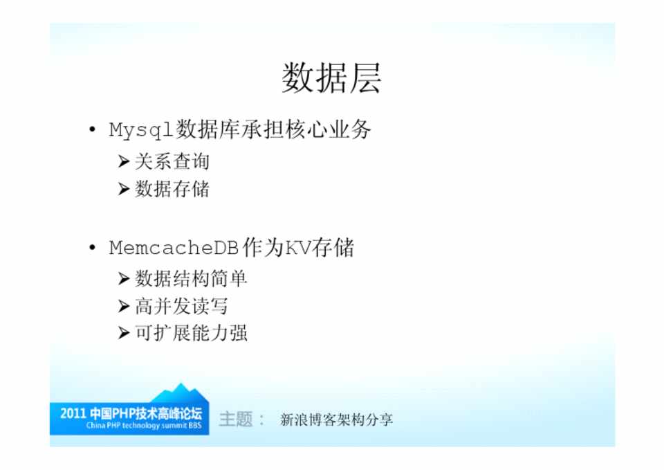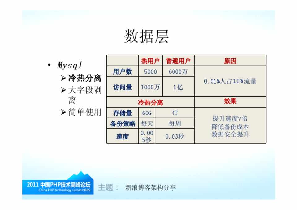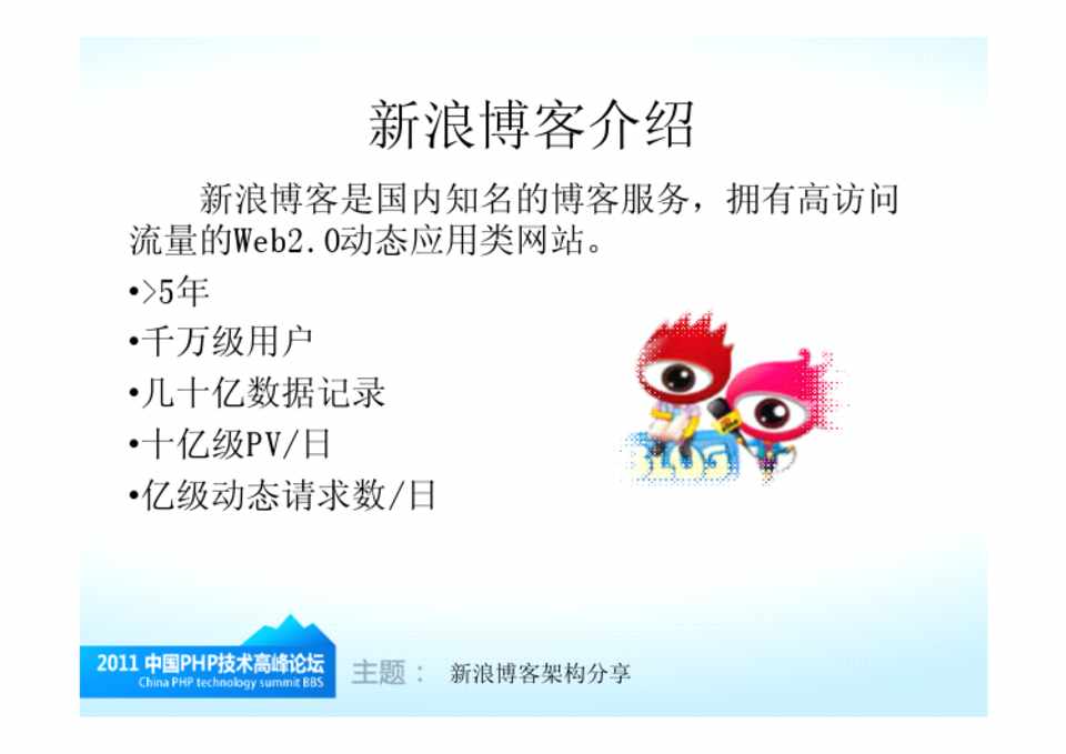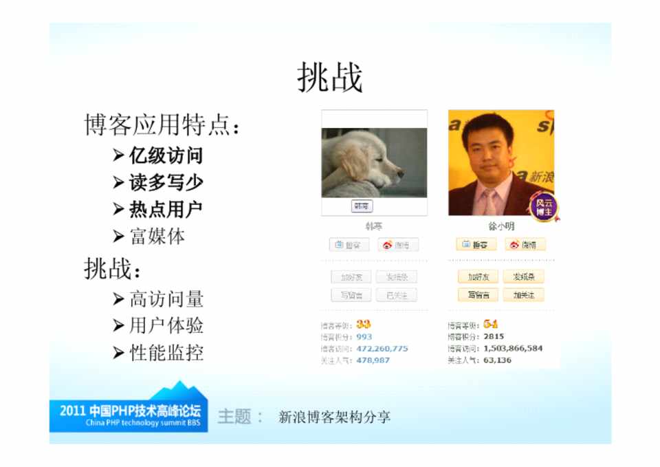 新浪博客是国内知名的博客服务,拥有高访问 流量的Web2.0动态应用类网站。 •>5年 •千万级用户 •几十亿数据记录 •十亿级PV/日 •亿级动态请求数/日