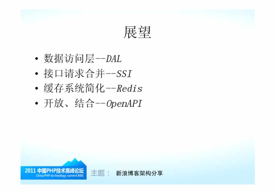 • 数据访问层--DAL • 接口请求合并--SSI • 缓存系统简化--Redis • 开放、结合--OpenAPI