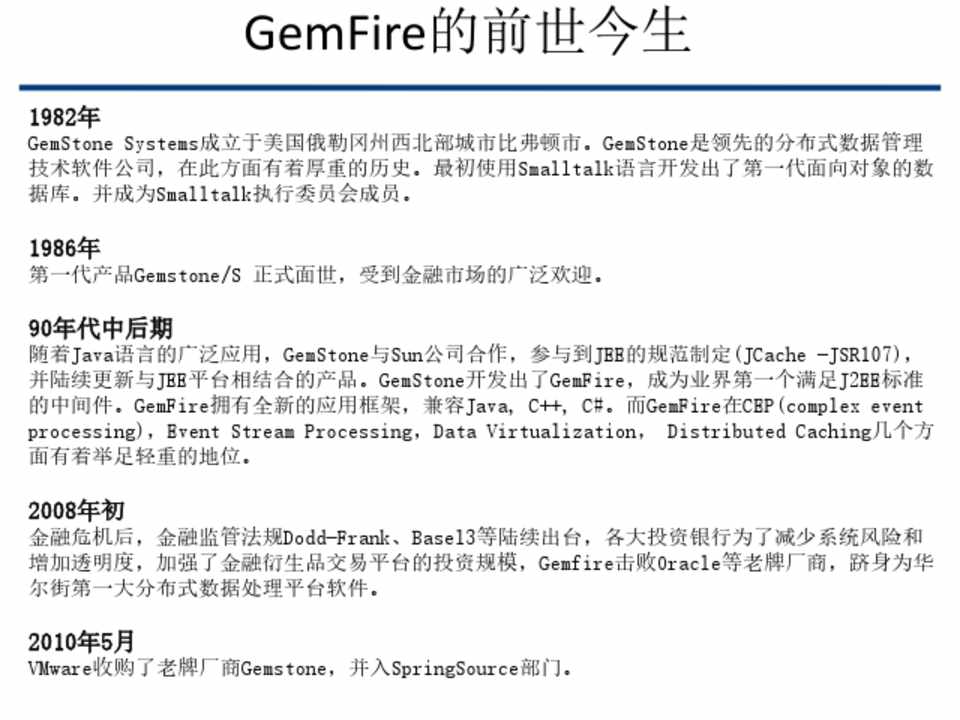 GemStone Systems成立于美国俄勒冈州西北部城市比弗顿市。GemStone是领先的分布式数据管理 技术软件公司,在此方面有着厚重的历史。最初使用Smalltalk语言开发出了第一代面向对象的数 据库。并成为Smalltalk执行委员会成员。